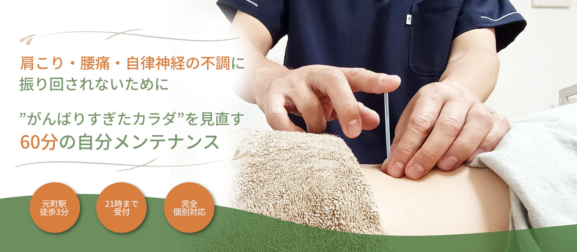 鍼灸・整体・マッサージすべてを駆使したオールインワン施術で、徹底的なメンテナンスをご希望の方向けの施術メニューです。