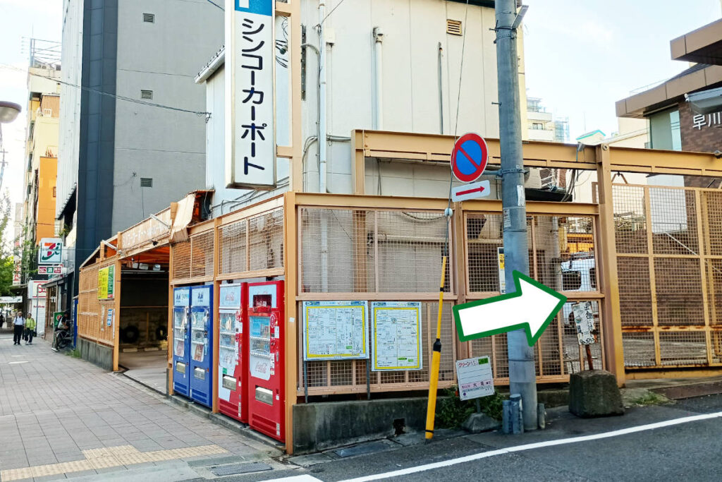 シンコーカーポート(有料駐車場)が見える交差点を左折します。